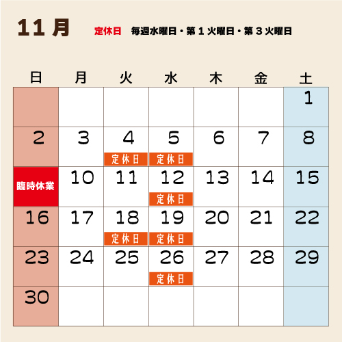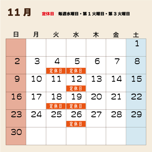 | 定休日 | 毎週水曜日・第1火曜日・第3火曜日 |